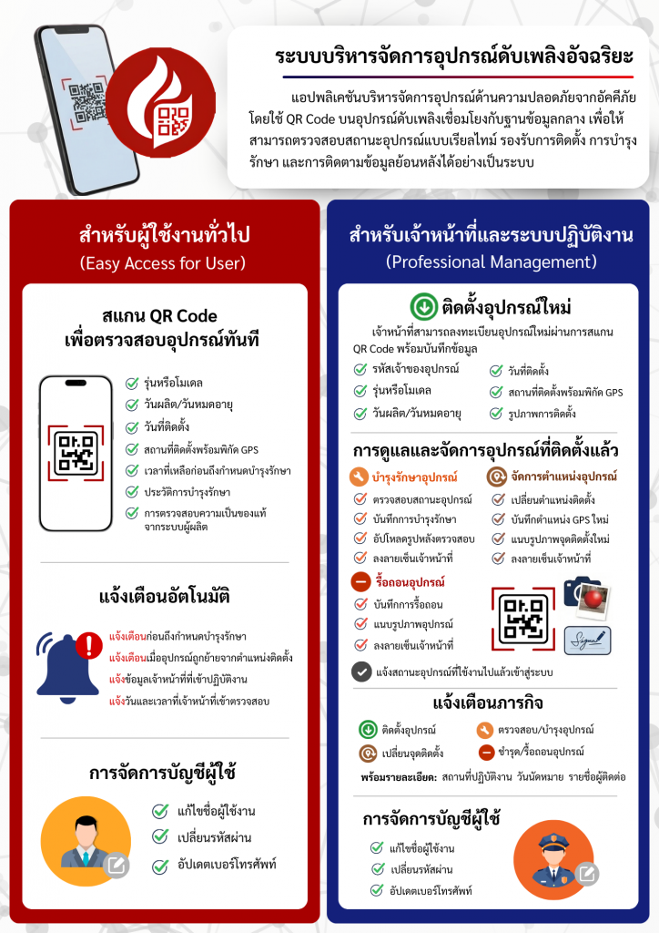 ระบบแจ้งเตือนวันดูแลรักษา (Maintenance Alert): แอปพลิเคชันจะทำการมอนิเตอร์และแจ้งเตือนเมื่ออุปกรณ์ใกล้ครบกำหนดตรวจสอบ หรือหมดอายุการใช้งาน เพื่อให้มั่นใจว่าอุปกรณ์ทุกชิ้นอยู่ในสถานะพร้อมใช้งาน 100%